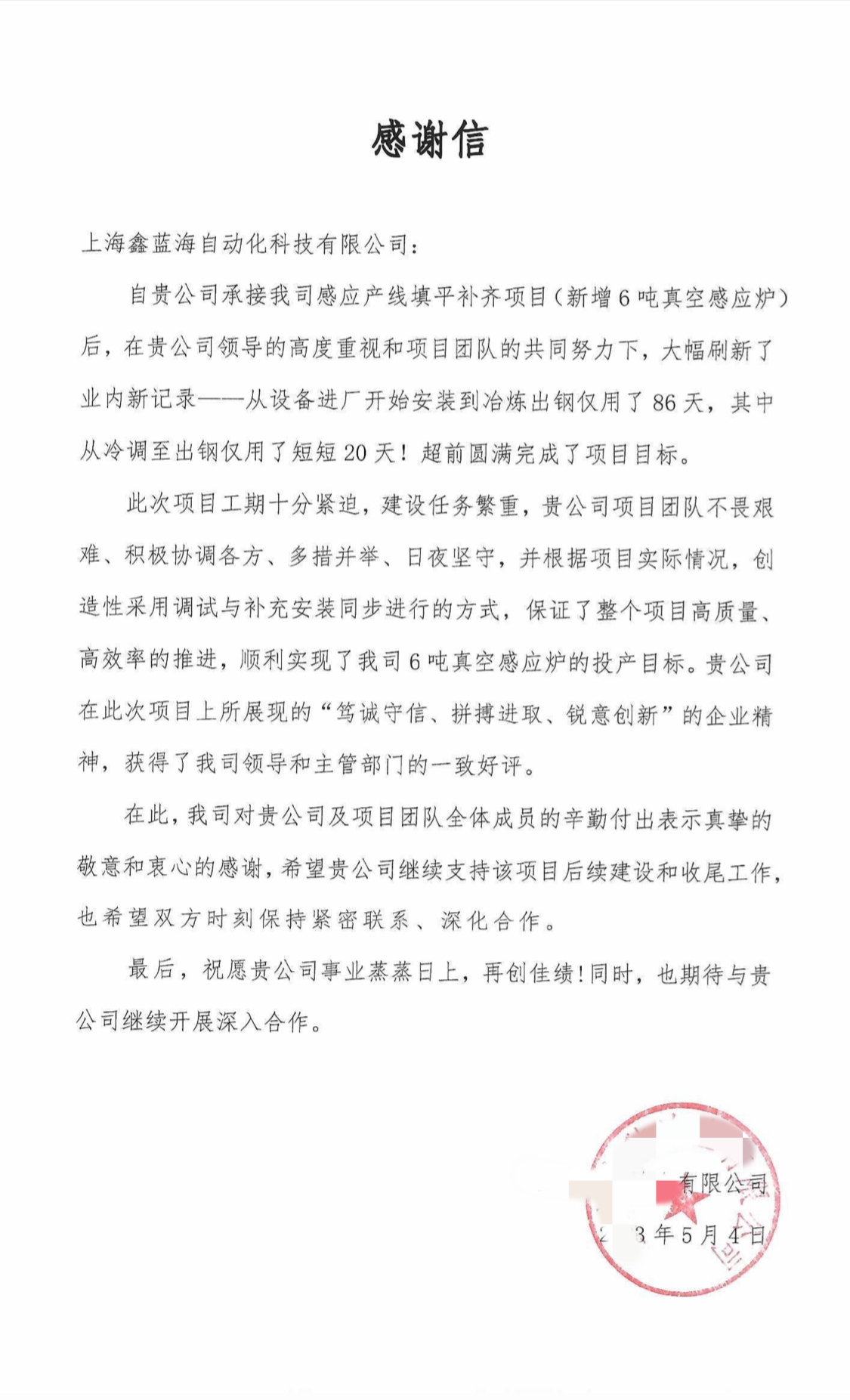 Receiving this letter of thanks full of customers' praise and high recognition of Xinlanhai's professional services, we are deeply encouraged and feel a great responsibility. In the future, we will continue to take this encouragement, always take customer needs as the starting point, take customer satisfaction as the orientation, constantly improve our core technology, and reward new and old customers with more high-end intelligent special metallurgy equipment and high-quality professional in-depth service!