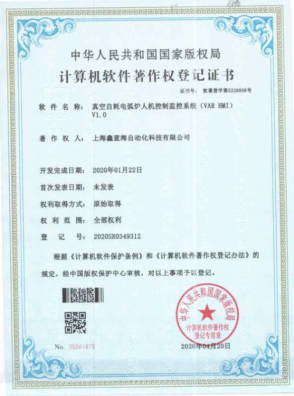 近日,上海鑫藍(lán)海自動化科技有限公司自主研發(fā)的真空自耗電弧爐人機(jī)控制監(jiān)測系統(tǒng)項(xiàng)目順利通過國家知識產(chǎn)權(quán)局審核,依照中華人民共和國專利法,由國家知識產(chǎn)權(quán)局正式頒發(fā)計(jì)算機(jī)軟件著作權(quán)登記證書。目前,該專利技術(shù)已成功運(yùn)用到我公司真空自耗電弧爐項(xiàng)目中,不僅節(jié)約了成本,創(chuàng)造了效益,同時有效地保護(hù)了企業(yè)的研發(fā)成果,極大的提高了我公司在冶金領(lǐng)域的核心競爭力!