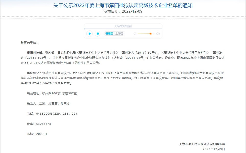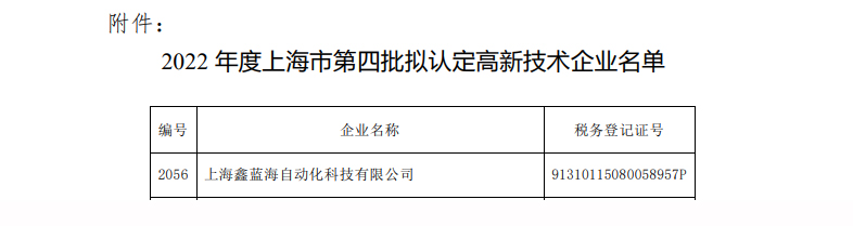 12月22日,由上海市科學(xué)技術(shù)委員會發(fā)布的“2022年度上海市第四批擬認(rèn)定高新技術(shù)企業(yè)名單”公示期已結(jié)束。鑫藍(lán)海再度被認(rèn)定為國家高新技術(shù)企業(yè),公司科技創(chuàng)新與技術(shù)能力再次得到國家相關(guān)部門的權(quán)威認(rèn)可。