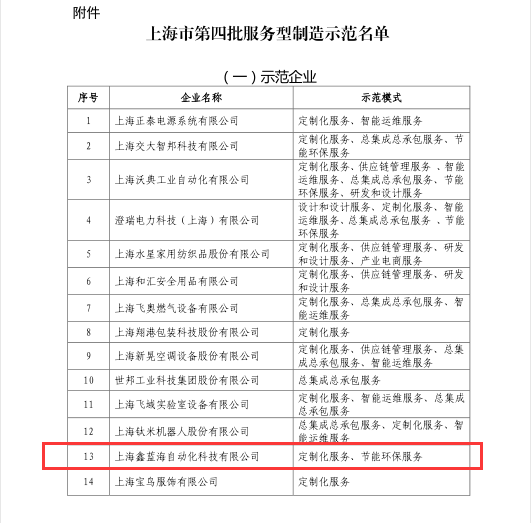 近期,上海市經(jīng)濟(jì)和信息化委員會(huì)公布了“上海市第四批服務(wù)型制造示范企業(yè)名單”,本次共有14家企業(yè)入選,上海鑫藍(lán)海自動(dòng)化科技有限公司申報(bào)的“定制化服務(wù)”和“節(jié)能環(huán)保服務(wù)”通過(guò)組織推薦、專家評(píng)審、網(wǎng)上公示等環(huán)節(jié),成功入選了第四批上海市服務(wù)型制造示范名單。